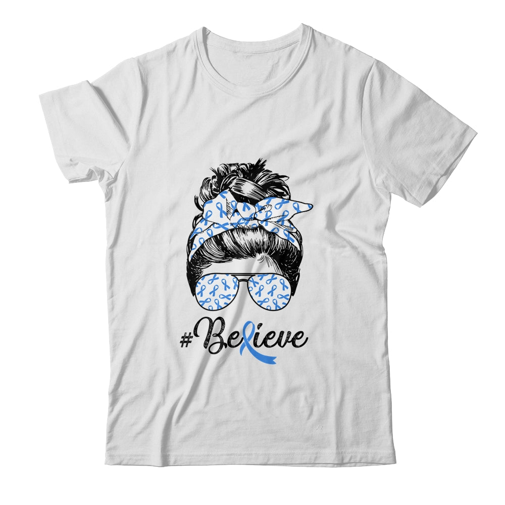Colon Cancer Awareness Messy Bun Warrior Believe Blue Mug